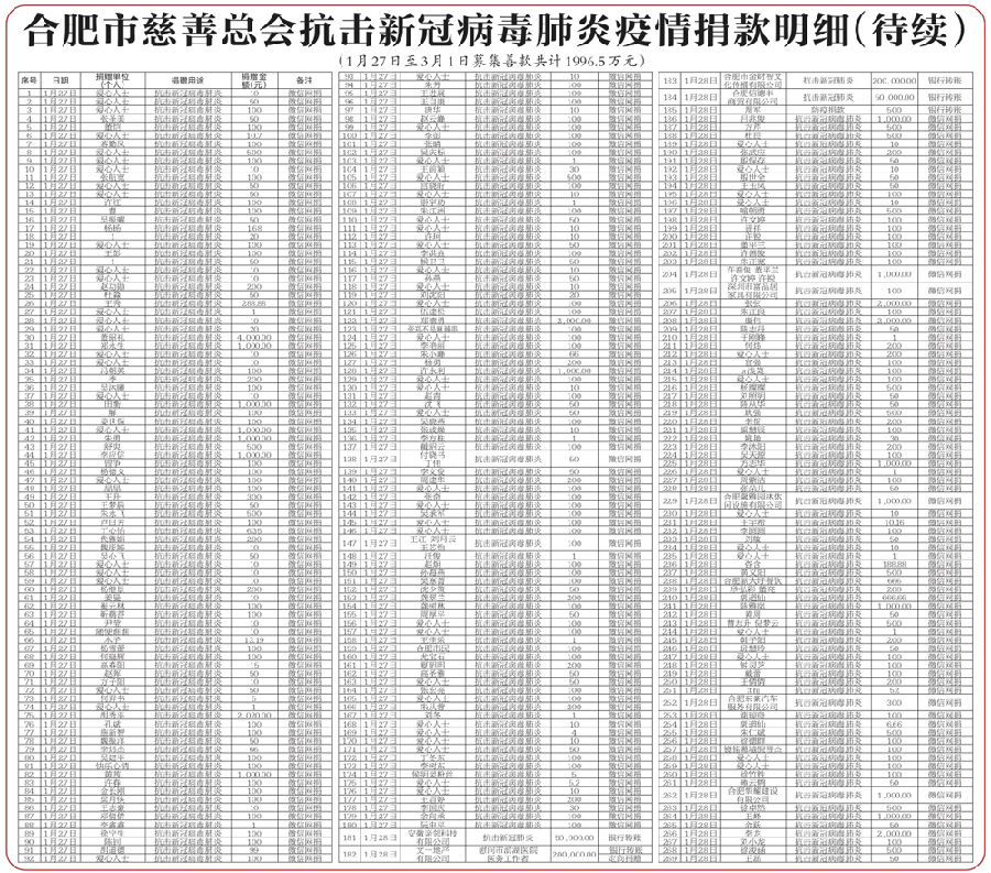 广泛发动,全方位行动。1月27日,合肥市慈善总会率先发出《呼吁书》,号召社会各界全力提供善款、善物支援疫区,并在微信公众号上开通“抗击新冠疫情”专用端口,为爱心人士提供方便。当日,公众号网络平台接收捐款19138.80元。隔日,市慈善总会又向所有理事、常务理事、副会长单位发出呼吁,倡议大家积极参与新冠疫情防控。截至3月1日16:00共收到捐款1996.5 万元,已支出1673.34万元,其中,向定点救治“新型冠状病毒肺炎”患者的医疗机构拨付787.64万元;向我市各县(市)区(开发 区)重点防控的乡镇、街道拨付680万元;向湖北省拨付105.70万元;向桐城市慈善会拨付100万元。